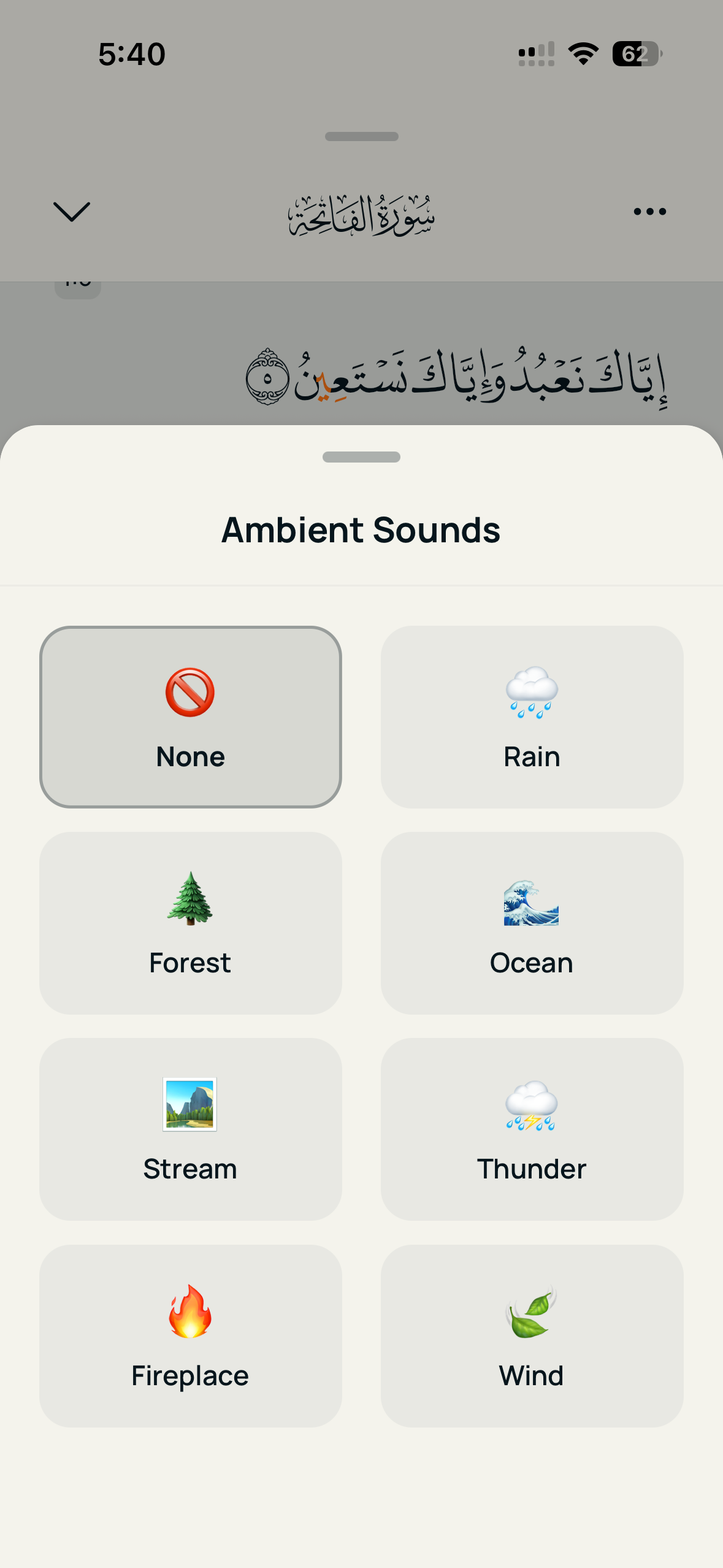 Layer calming nature soundscapes over your recitation. Rain, ocean waves, forest, and more, each with independent volume control.