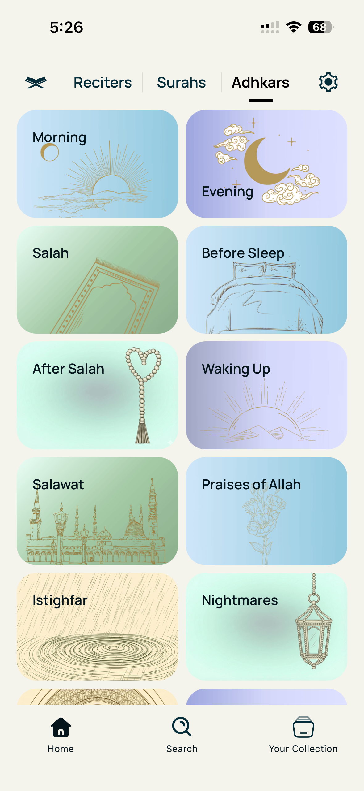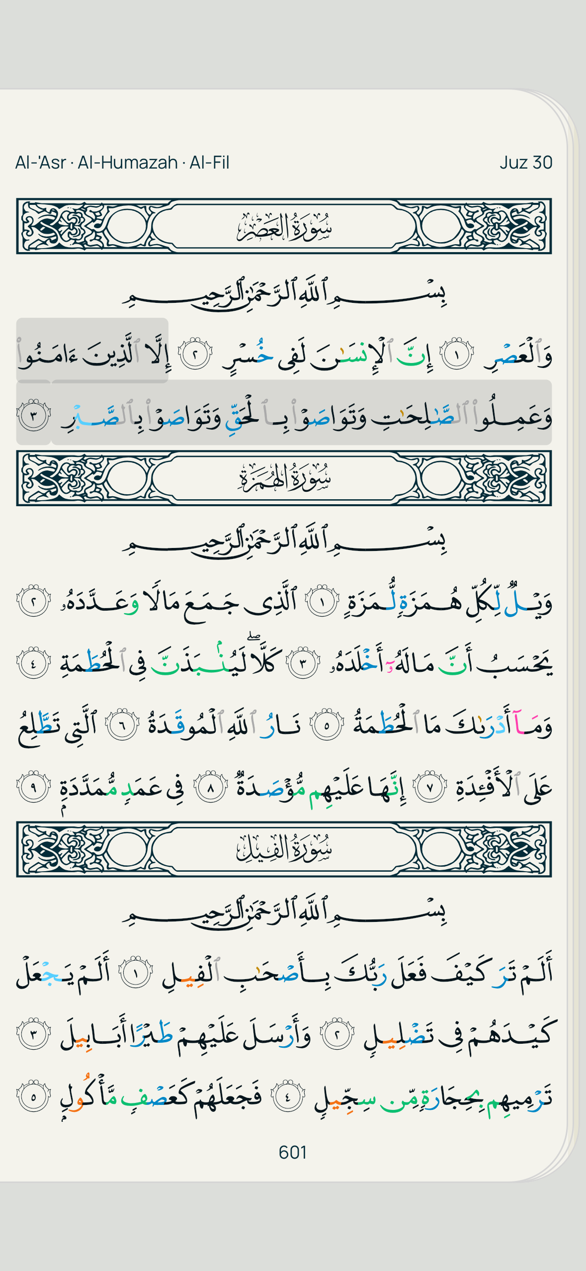 A full-page Mushaf you can read anywhere. Every page looks exactly like a printed copy, with tajweed colors to guide your recitation and a full-screen mode for distraction-free reading.